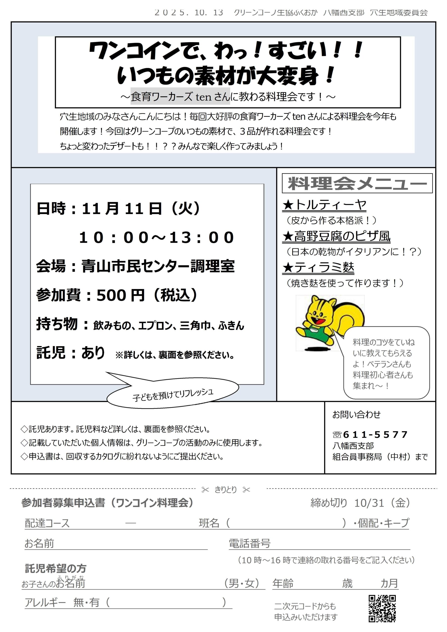穴生地域のみなさんこんにちは!毎回大好評の食育ワーカーズtenさんによる料理会を今年も開催します!今回はグリーンコープのいつもの素材で、3品が作れる料理会です!ちょっと変わったデザートも!!??みんなで楽しく作ってみましょう!