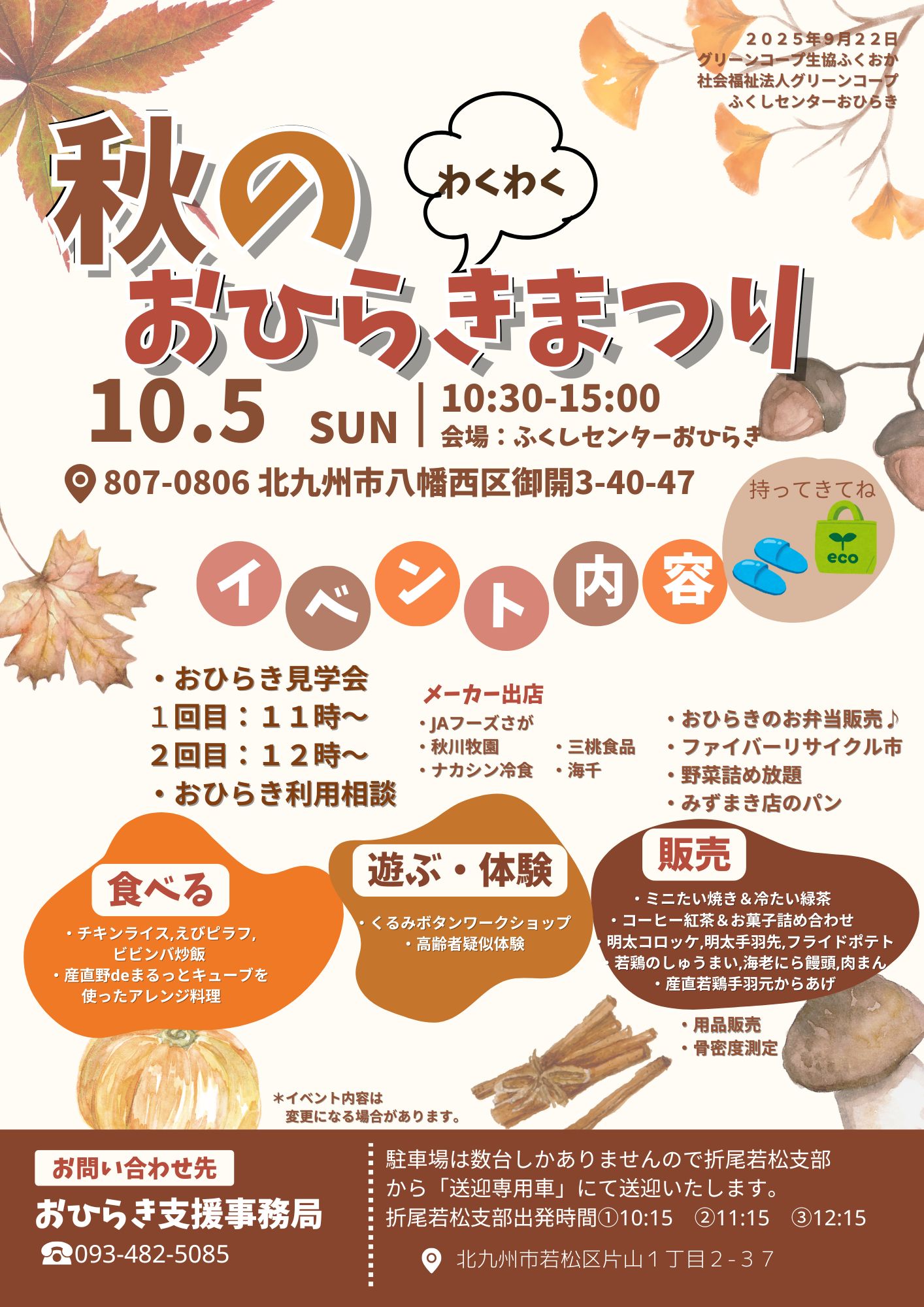 こんにちは!社会福祉法人グリーンコープふくしセンターおひらきをご存じですか。昨年好評だったおひらきまつりを今年も開催します!!おひらき見学会、おひらきのお弁当販売、メーカー出店、支部出店、みずまき店のパン販売、ファイバーリサイクル市など楽しい内容となっています。ぜひ遊びに来てください♬駐車場は数台しかありませんので折尾若松支部から「送迎専用車」にて送迎いたします。折尾若松支部(北九州市若松区片山1丁目2-37)出発時間①10:15②11:15③12:15