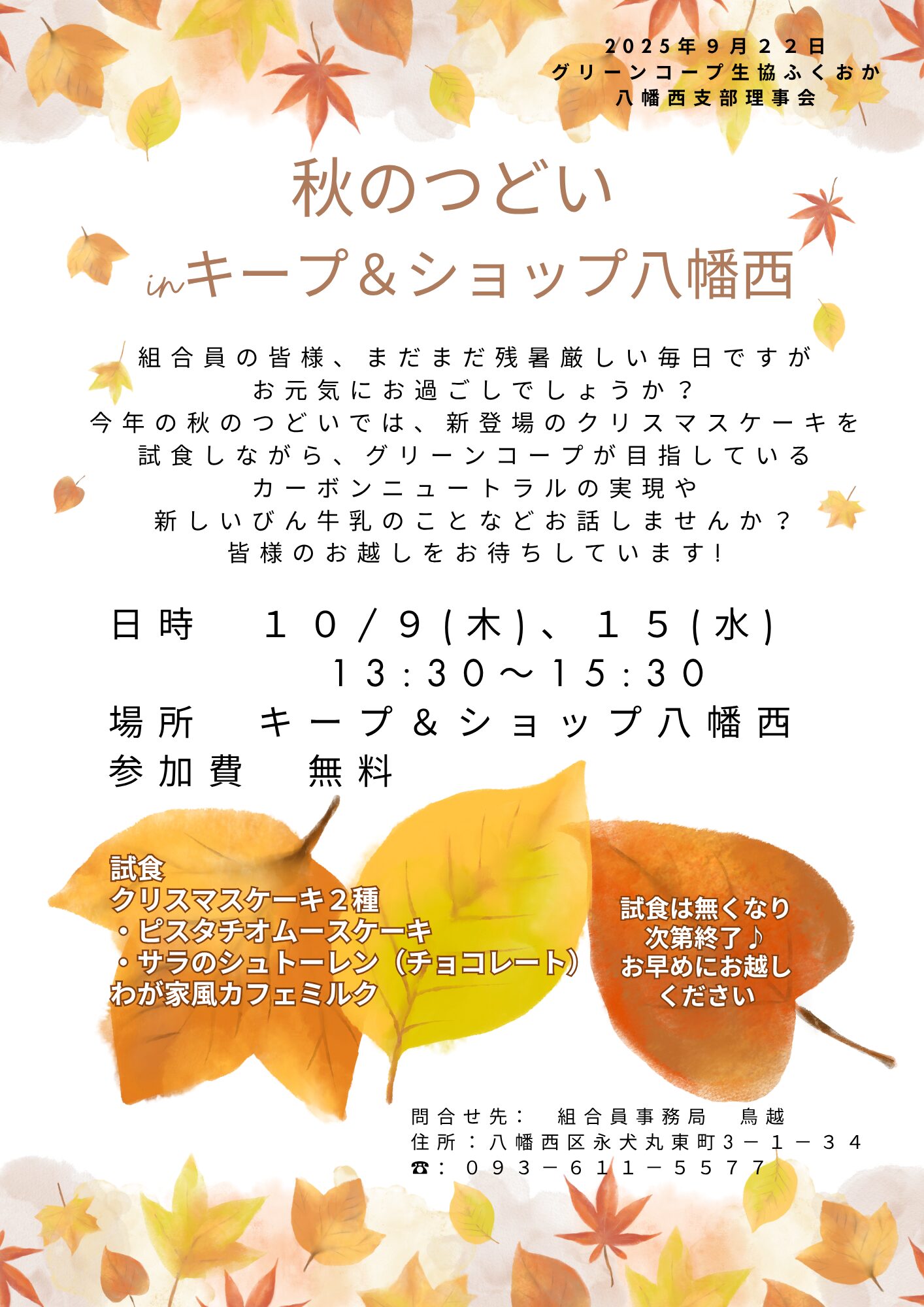 今年の秋のつどいでは、新登場のクリスマスケーキを試食しながら、グリーンコープが目指しているカーボンニュートラルの実現や新しいびん牛乳のことなどお話しませんか?