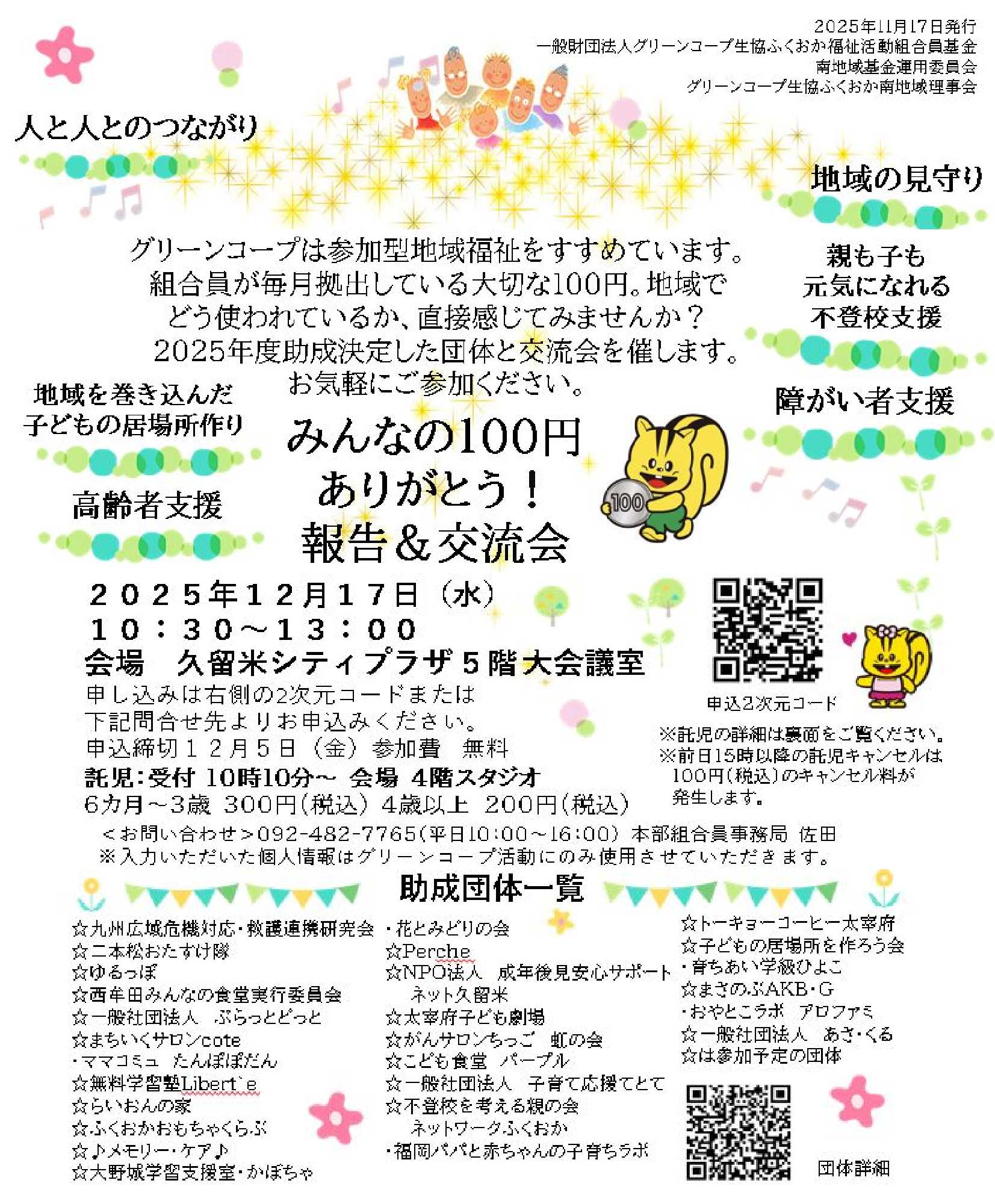 グリーンコープでは参加型地域福祉をすすめるため、福祉活動組合員基金(100円基金)から地域で活動する団体にも助成をおこなっています。2025年度助成決定した団体と交流会を催します。組合員が毎月拠出している大切な100円。地域でどう使われているか、直接感じてみませんか。
