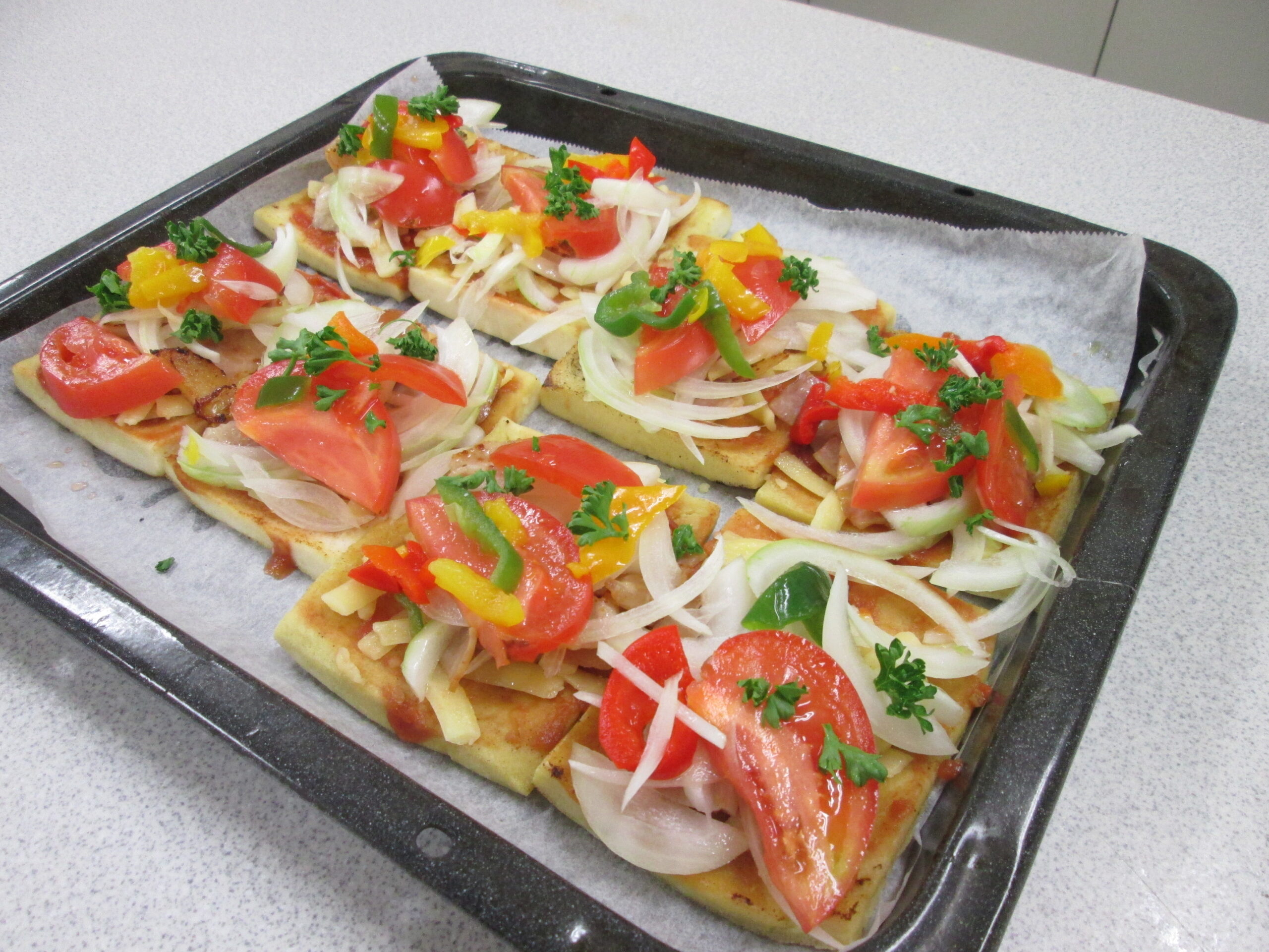 高野豆腐のピザ風は、高野豆腐をピザ生地に見立ててオリーブオイル、お野菜たっぷりでオーブンで焼き上げました。いつも煮物で使う高野豆腐が洋風に大変身!お子様も喜んで食べてくれそうです。