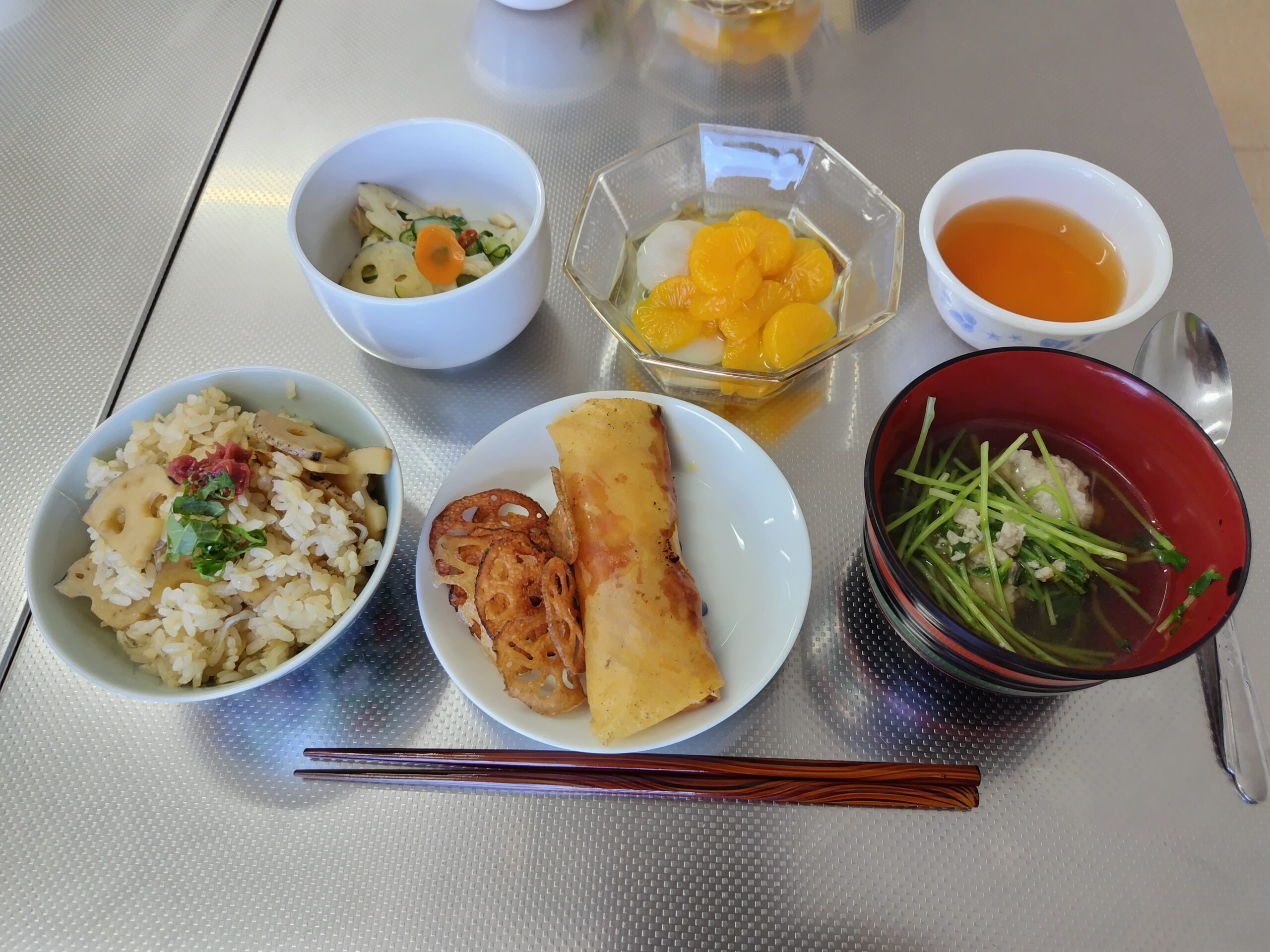 今回のメニューは、「れんこんご飯」「れんこんと鶏肉の中華和え」「れんこんの包み揚げ(えび入り)」「れんこん入り鶏つくねのお吸い物」「れんこん白玉のフルーツポンチ」と、れんこん料理のフルコース。みんなで楽しく料理して、舌鼓を打ちながらいただきました。一番人気は「包み揚げ」でしたよ(^^♪