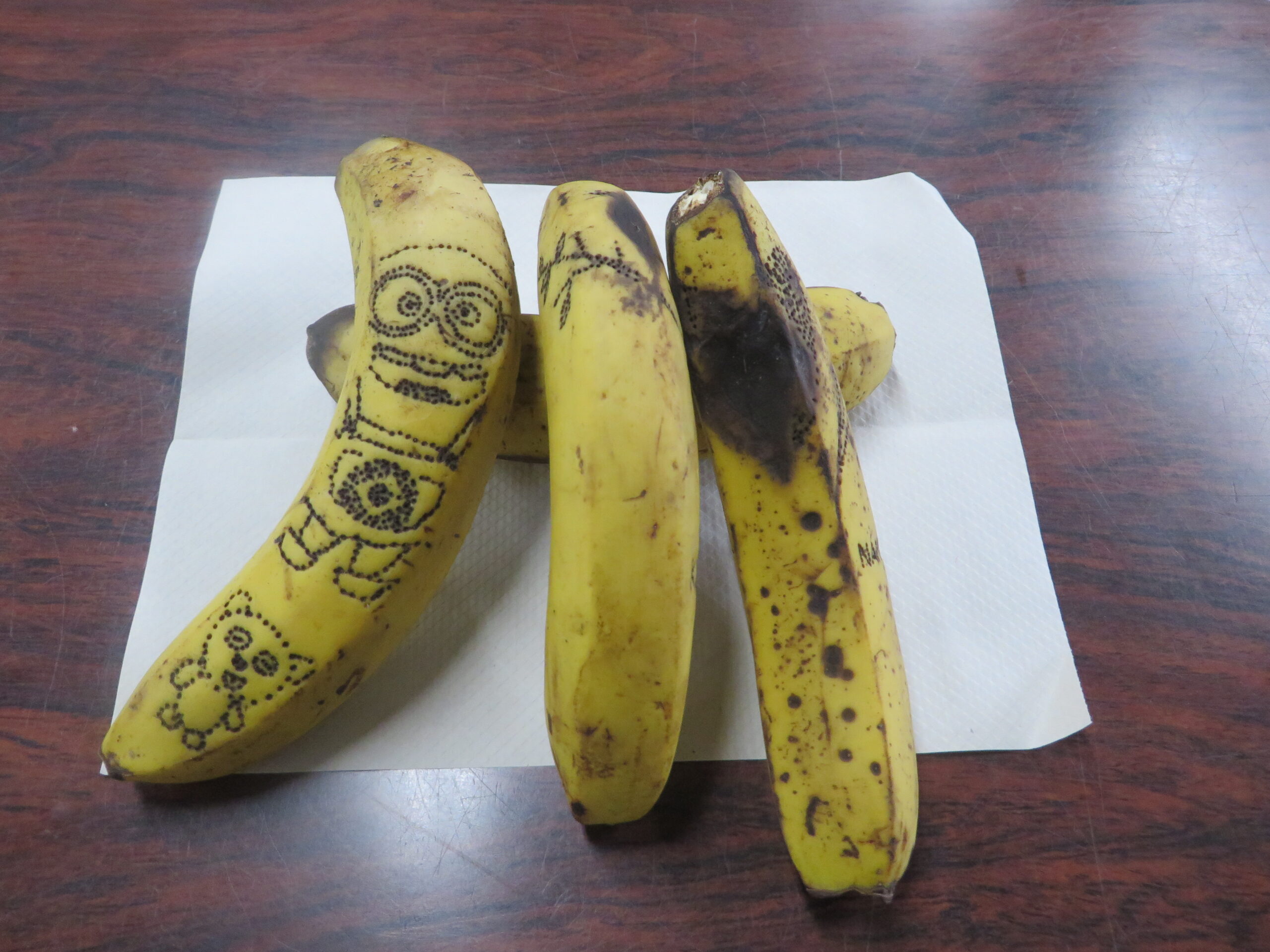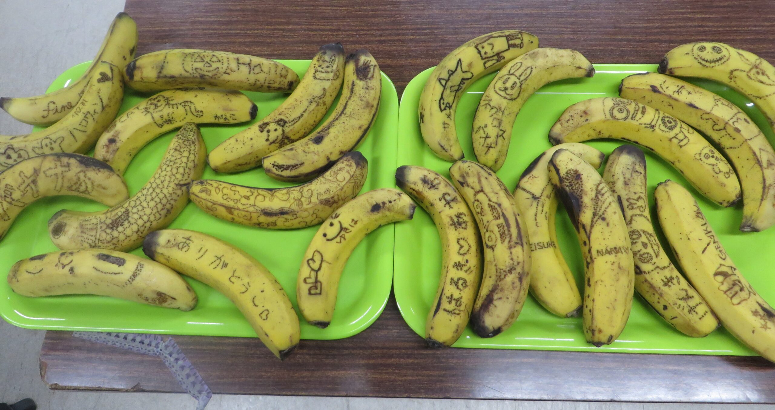規格外のバラコンバナナの傷や斑点を何かに見立てながら、竹串で絵や文字を点描しました。無心に描けて楽しく、「家庭でも子どもたちとやりたい」という参加者もいました。