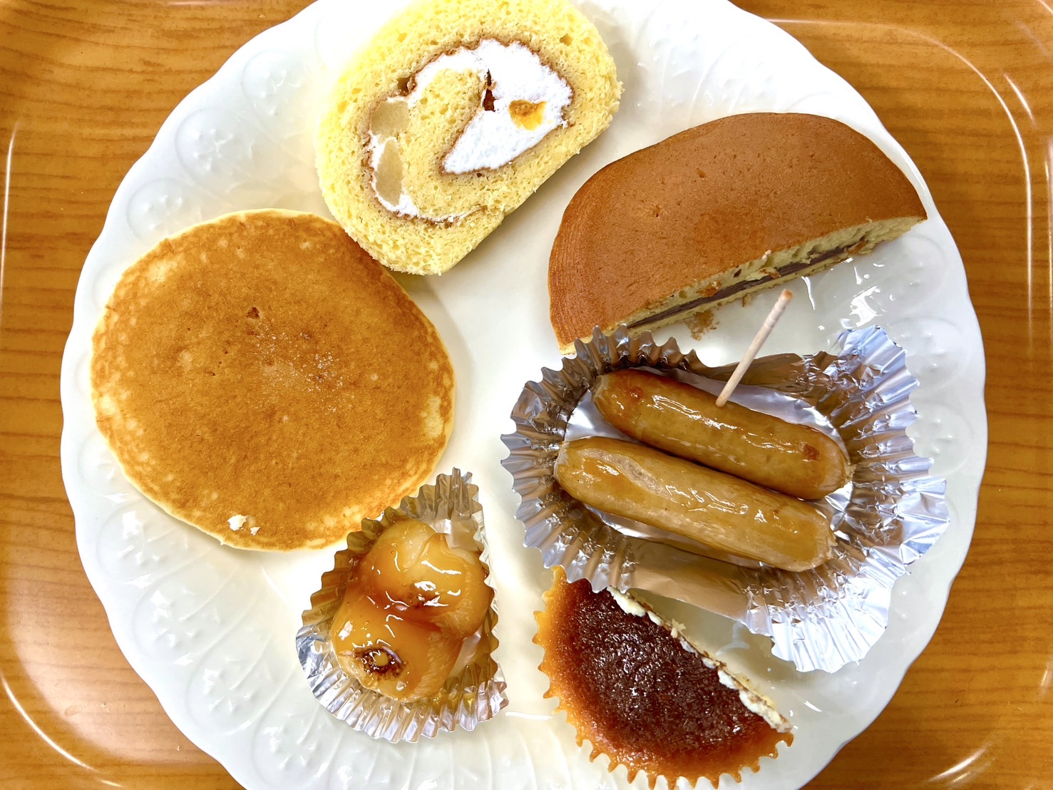 写真:(株)丸きんまんじゅうの商品から5品(GCフルーツロールケーキ、GCどら焼き、GCみたらし団子、GCミニホットケーキ、GCバスクチーズケーキ)を厳選し試食しました。参加者のみなさんはお気に入り商品を見つけたり、新しい食べ方を発見することができた様子でした☆